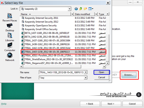 نضغط على browse و نختار المفتاح المرفق مع ملف التحميل و ننقر على Open